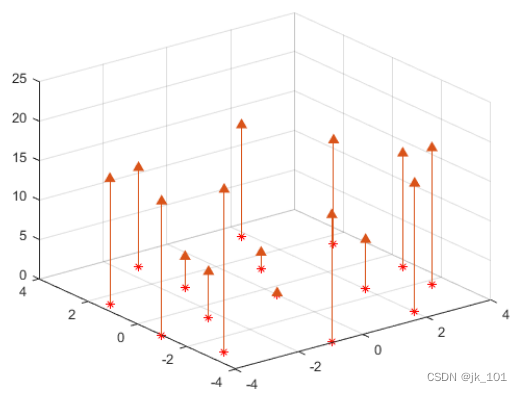 stem3(X(:,1),X(:,2),V,'^','fill')