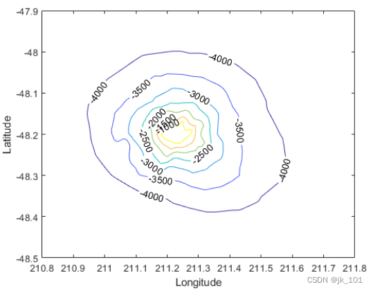 draw seamount Data sets ( Seamounts are underwater mountains ). The dataset contains a set of longitudes (x) And latitude (y) Location , And the corresponding measurements at these coordinate positions seamount At an altitude of (z).