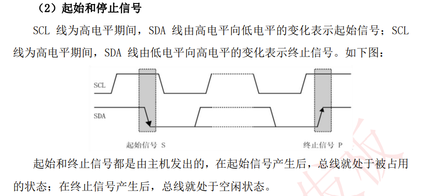 总线通过上拉电阻接到电源。当 I2C 设备空闲时,会输出高阻态,而 当所有设备都空闲,都输出高阻态时,由上拉电阻把总线拉成高电平。