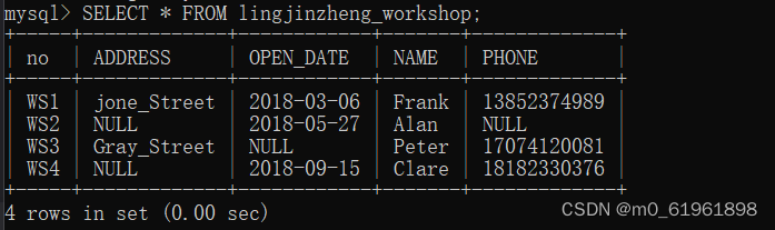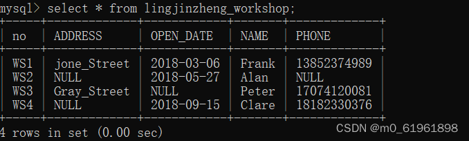 select phone from linjinzheng_workshop where no=“WS2”;