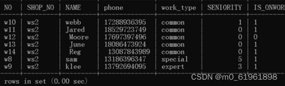 -> where shop_no="WS2" and IS_ONWORK!=0;他要求你查询不是今年入职的所有非普通员工,你很想怼他说数据库把并没有入职时间字段