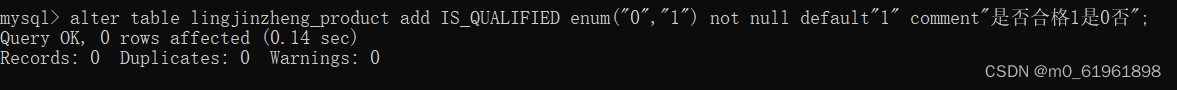 alter table lingjinzheng_product add IS_QUALIFIED enum("0","1") not null default"1" comment"是否合格1是0否";观察表中数据发现产品编号应该用整数类型,并且设置自动增加,所以你修改了产品编号字段的数据类型,并查看了产品表的字段信息