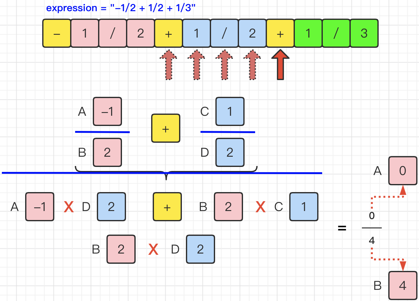 Because the calculation rule of two scores is :A/B + C/D = (AD + BC)/BD perhaps A/B - C/D = (AD - BC)/BD, So no matter how many fractions are added , namely :N individual , We can all go through ((N(1) * N(2)) * N(3)) * N(4).... And so on . So when we find the first plus sign / When the minus sign , You can do that. A and B Assign a value , Then through the while Loop through the next plus sign / minus sign , After traversing , Assigned to it again C and D. here , adopt (AD + BC)/BD perhaps (AD - BC)/BD After calculating the result of two scores , Then assign the numerator of the result to A, Assign the denominator to B. And then through while Go on to the next cycle , The latest value obtained is still assigned C and D, Then calculate the two molecules . And so on . The following is the specific operation of the second round of symbol determination, as shown in the following figure :