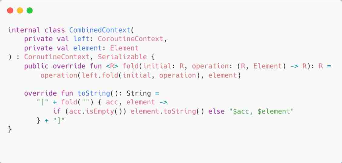 Put two CoroutineContext Combine into one CoroutineContext, If two are of the same type Element Will return a new Element. If it's two different types Element Will return a CombinedContext. If there are many different types of Element Will return a message CombinedContext Linked list .