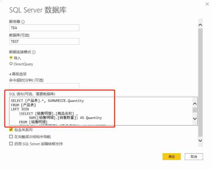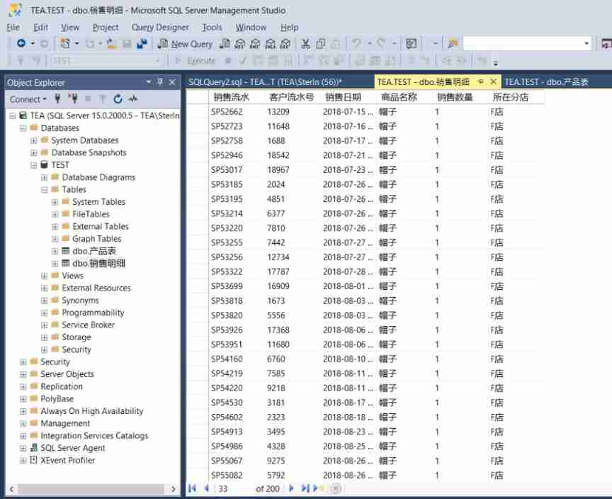 In the database of white tea machine , There is a name “TEST” The database of , There is a name “ Product list ” The dimension table and the name are “ Sales details ” The fact sheet of .