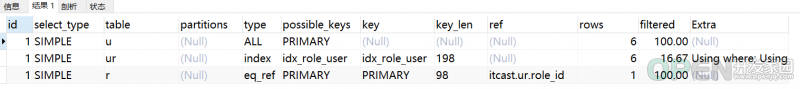 explain select * from t_role r, t_user u, user_role ur where r.id = ur.role_id and u.id = ur.user_id ;