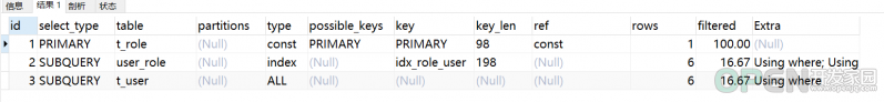 EXPLAIN SELECT * FROM t_role WHERE id = (SELECT role_id FROM user_role WHERE user_id = (SELECT id FROM t_user WHERE username = 'stu1'));