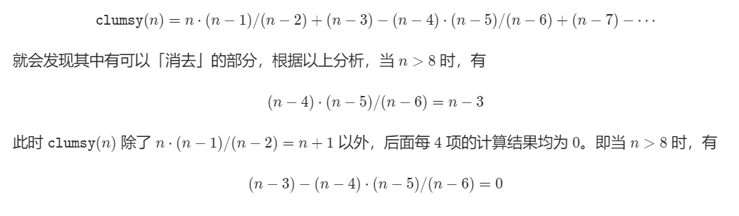 剩下不能够成 4个一组成对「消去」的情况需要分类讨论。由于「笨阶乘」按照「乘」「除」「加」「减」循环的顺序定义运算,将 n 按照对 4 取模的余数分类讨论。