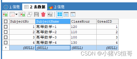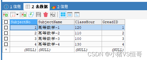 # practice 1: Add data CREATE TABLE `subject`( `SubjectNo` INT(10) NOT NULL COMMENT ' Course number ', `SubjectName` VARCHAR(50) NOT NULL COMMENT ' Course name ', `ClassHour` VARCHAR(10) NOT NULL COMMENT ' Class hours ', `GreadID` INT(10) NOT NULL COMMENT ' Grade number ', PRIMARY KEY(`SubjectNo`) ); # Use insert Statement to user Add data to the table # grammar :insert into Table name ( Field 1, Field 2, Field 3, … )values(' value 1', ' value 2', ' value 3',…); INSERT INTO SUBJECT VALUES(1,' Advanced mathematics -1','120',1); INSERT INTO SUBJECT VALUES(2,' Advanced mathematics -2','110',2); INSERT INTO SUBJECT VALUES(3,' Advanced mathematics -3','100',3); INSERT INTO SUBJECT VALUES(4,' Advanced mathematics -4','130',4); # grammar :update Table name set Field name 1= The new data 1, Field name 2= The new data 2,...where.... # Put the data sheet subject in ClassHour Greater than 110 And GradeID by 1 Class hours are reduced 10 UPDATE SUBJECT SET classHour=classHour-10 WHERE classHour>110 AND GreadID=1;(3) Output results :