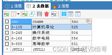 # Use delete Statement delete data # grammar :delete from Table name [where condition] #------------------------------------------------------- # Create table CREATE TABLE `subject1`( `SubjectNo` INT(10) NOT NULL COMMENT ' Course number ', `SubjectName` VARCHAR(50) NOT NULL COMMENT ' Course name ', `ClassHour` VARCHAR(10) NOT NULL COMMENT ' Class hours ', `GreadID` INT(10) NOT NULL COMMENT ' Grade number ', PRIMARY KEY(`SubjectNo`) ); #------------------------------------------------------- # Use insert Statement to user Add data to the table # grammar :insert into Table name ( Field 1, Field 2, Field 3, … )values(' value 1', ' value 2', ' value 3',…); INSERT INTO SUBJECT1 VALUES(1,' Advanced mathematics -1','120',1); INSERT INTO SUBJECt1 VALUES(2,' Advanced mathematics -2','110',2); INSERT INTO SUBJECT1 VALUES(3,' Advanced mathematics -3','100',3); INSERT INTO SUBJECT1 VALUES(4,' Advanced mathematics -4','130',4); #------------------------------------------------------- # Use delete Statement delete data # grammar :delete from Table name [where condition] #(1)condition Filter by , If not specified, delete all data of the table DELETE FROM subject1; #(2) Delete subject1 In the table GreadID Greater than 2 The data of DELETE FROM subject1 WHERE GreadID>2;(3) Output results