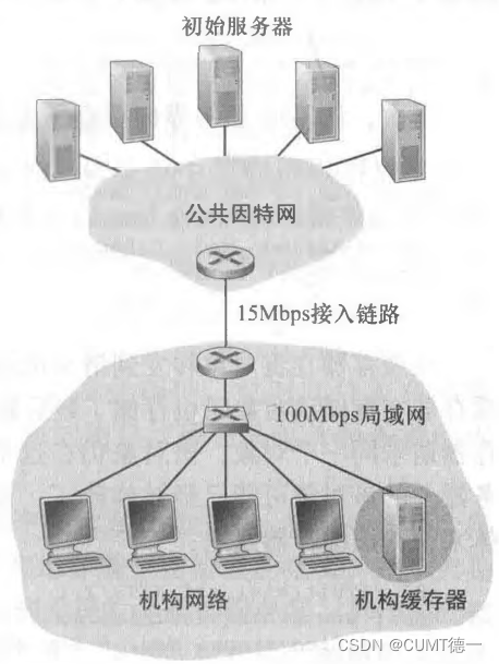 机构网络是一个高速局域网,这些初始服务器与因特网相连但位于全世界各地。因为所有通信量都经过一条链路,就会导致链路上的时延很大。一个可能的解决办法就是增加接入链路的速率,但是这种方法成本太高。