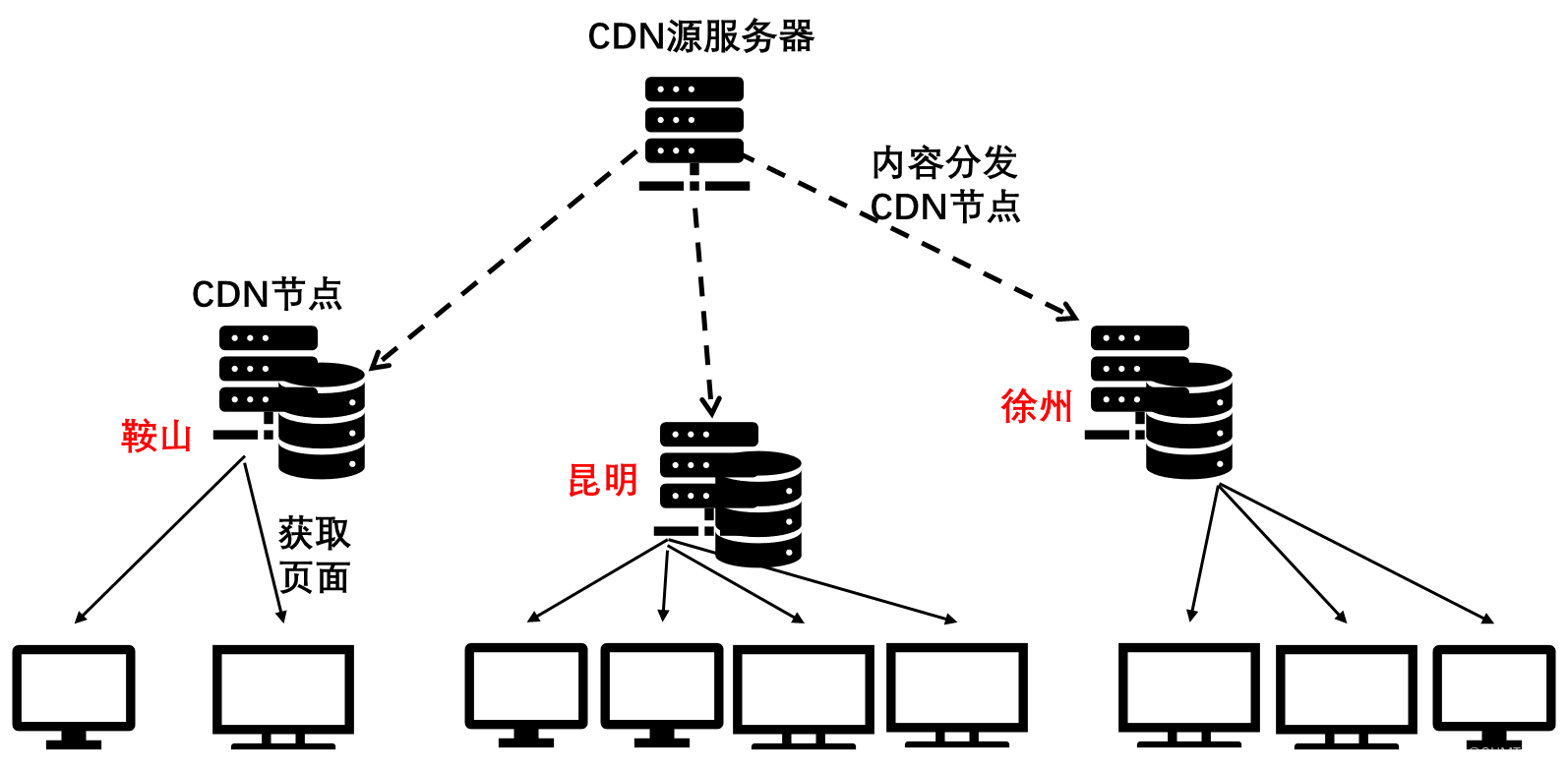 如下图,这是一棵树,CDN的源服务器将一份内容副本分发到CDN中的其他节点。在这个例子中,这些节点分别位于鞍山、昆明和徐州,图中用虚线表示。然而,客户端从就近的CDN节点获取页面,图中用实线表示,这样,在鞍山的客户获取的都是存储在鞍山的页面副本,他们不会从源服务器处获取页面,源服务器可能在西南。