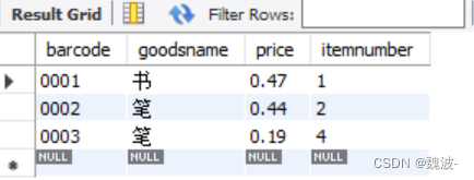 INSERT INTO demo.goodsmaster( barcode, goodsname, price)VALUES ( '0003', ' pen ', 0.19);(3) Query table structure and data