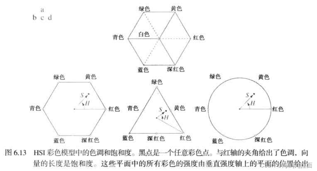 HSI The important component of color space is the vertical intensity axis 、 The length of the vector to a color point and the angle between the vector and the red axis . It doesn't matter in what shape the chromaticity plane appears , Because any of these shapes can be transformed into other shapes through geometric transformation .