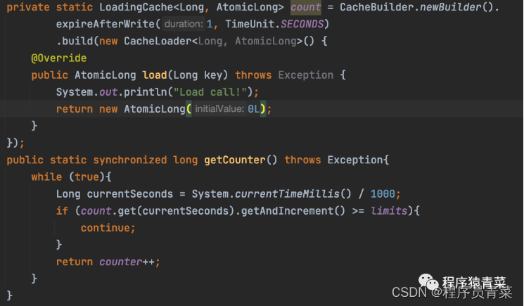 Ideas : establish LoadCaching object , Set the validity period to 1 second , cache Key For timestamps ( The current number of seconds ), Value is a counter ( The number of calls is accumulated ), If the query hit counter is incremented , Do not process when the counter value is greater than the limit value , If there is no command , Create a new timestamp cache and initialize the value to 0, To achieve the purpose of current limitation .