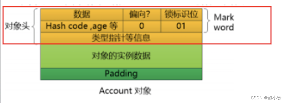 偏向锁的操作不用直接捅到操作系统,不涉及 用户到内核转换 , 不必要直接升级为最高级 ,我们以一个account对象的“对象头”为例,