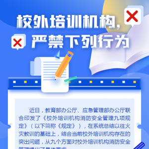 Pour la mise en œuvre《Bureau général du Comité central du PCC Avis du Bureau général du Conseil d'État sur la poursuite de l'allégement de la charge de travail des étudiants et de la formation extrascolaire dans l'enseignement obligatoire》Esprit, Normaliser la gestion de la sécurité incendie dans les établissements de formation hors campus , Prévenir strictement les accidents d'incendie , Maximiser la sécurité de la vie et des biens des étudiants et des praticiens de la formation ,Les derniers jours,General Office of the Ministry of Education、 Publié conjointement par le Bureau général du Département de la gestion des urgences 《Neuf règlements sur la gestion de la sécurité incendie des établissements de formation extrascolaire》(Ci - après dénommée《Le règlement》), Sur la base d'un résumé systématique des leçons tirées des incendies passés , Combiner les problèmes actuels des établissements de formation hors campus , Les exigences spécifiques en matière de gestion de la sécurité incendie dans les établissements de formation extrascolaire sont présentées sous neuf aspects. .