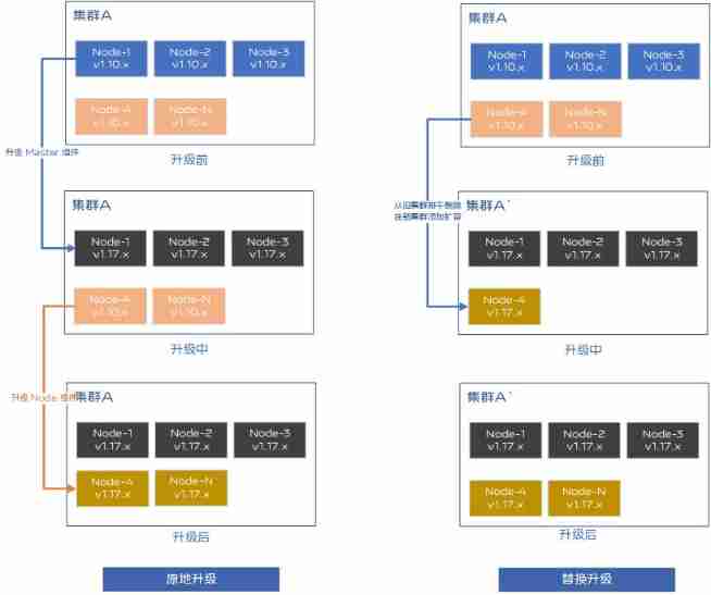 2) The advantage of replacement upgrade is that it is more atomic , Upgrade each node step by step , There is no intermediate state in the upgrade process , More secure for business ; The disadvantage is that the workload of cluster upgrading is large , Draining operation is right pod Restart sensitive applications 、 Stateful application 、 Single copy applications are not friendly .