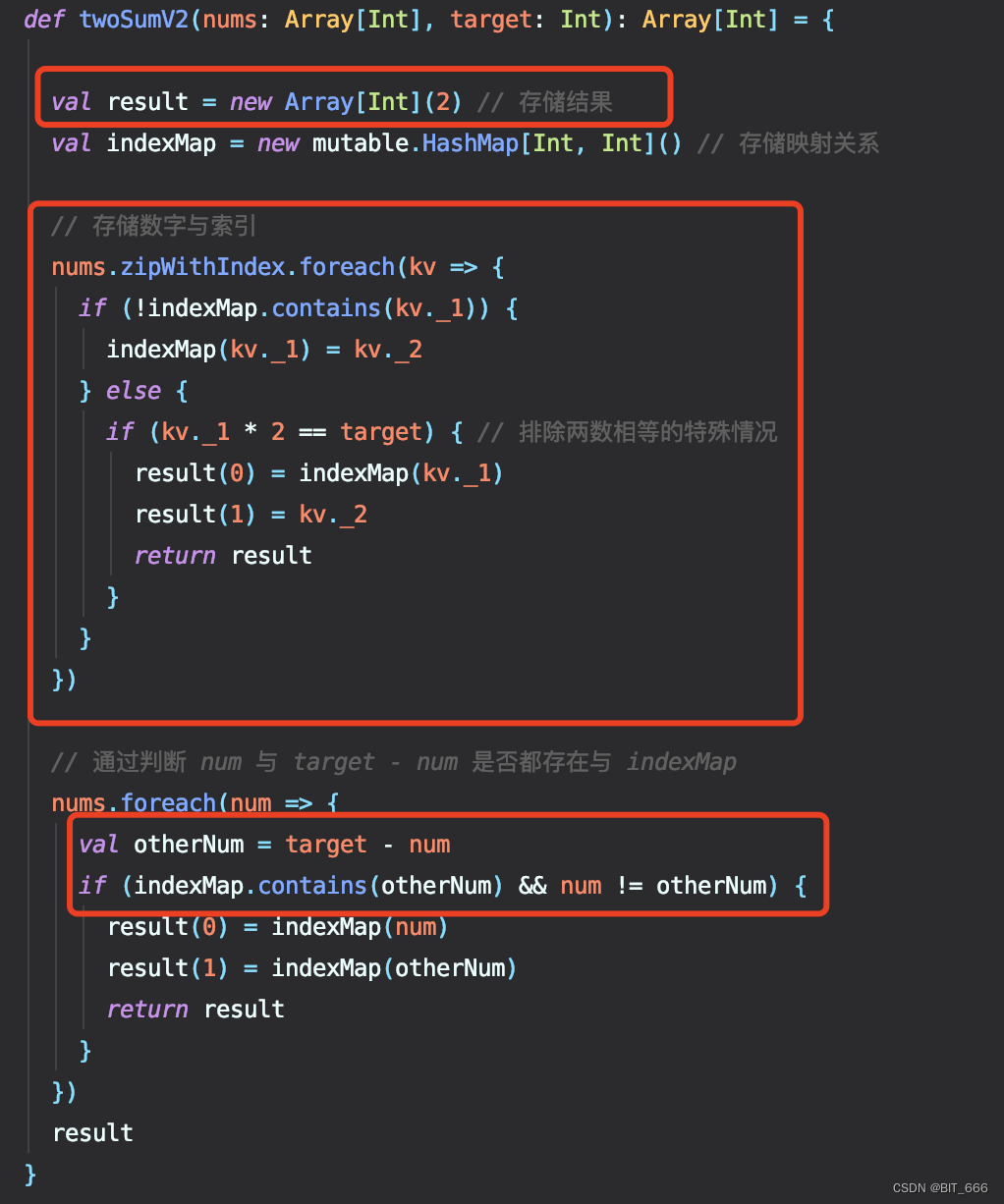 scala Can pass zipWithIndex Realization nums Array and index index Corresponding , I first used it directly toMap, But there's a problem , That is, if nums There is the same num Will cause index Overwrite and lose , So there is a special case excluding the equality of two numbers .