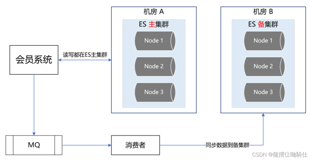 We have two computer rooms , They are the computer room A And the computer room B. We put ES The main cluster is deployed in the computer room A, hold ES The standby cluster is deployed in the computer room B. The reading and writing of the membership system are ES Main cluster , adopt MQ Synchronize data to ES Standby cluster .