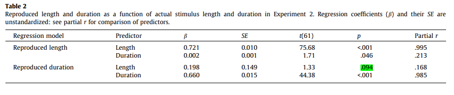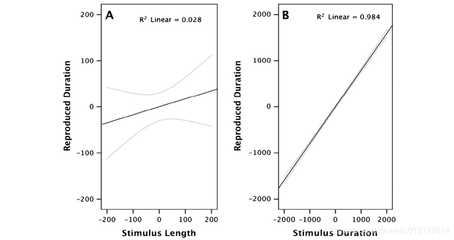 Calculate the length of the stick copied under each condition length And length duration As the dependent variable , To be practical length and duration As predictors The independent variables , The regression analysis is as follows :