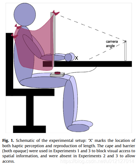32 Subjects participated in 8( Stick length ,100-450mm)×8( Length of sound ,1000-4500ms)×2( Copy task , Stick length / Length of sound ) In subject experiment design . In the experiments , The subjects' vision was completely blocked , Each try , The tried hand touch obtains the stick length information , At the same time, the main test player plays audio randomly , After the audio frequency is over, the subjects are randomly asked to copy the stick length or sound length . The experimental setup is shown in the figure below :