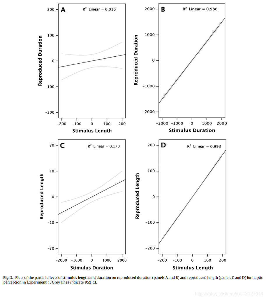 2) The copied length increases with the actual length (R² Linnear = 0.986, p<.001), But there is no significant linear relationship with the actual stick length (R² Linnear = 0.016, p = 0.161), This means that under the condition of acquiring spatial information through touch , Space has no significant effect on time perception .