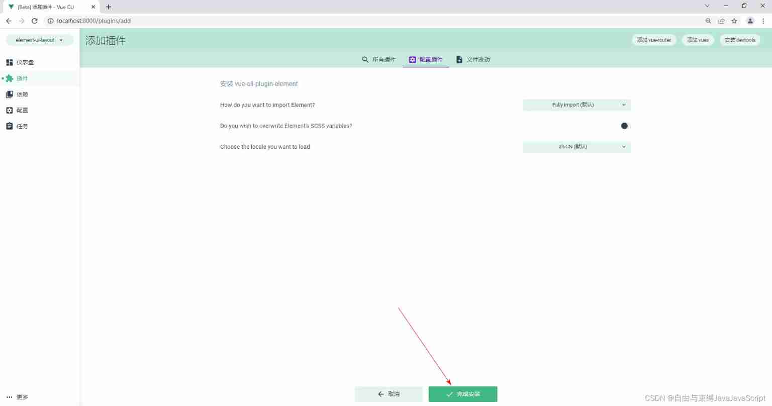2.3. Choose vue-cli-plugin-element, Click on the install vue-cli-plugin-element.