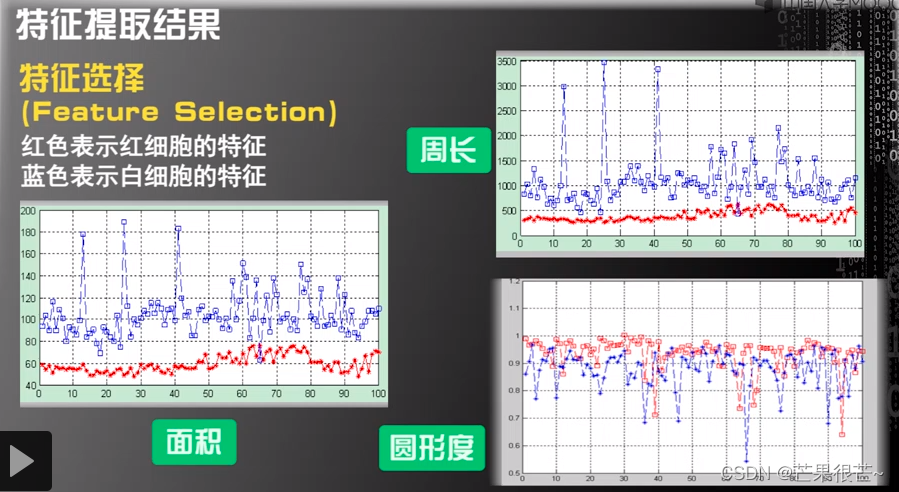 It can be seen that , The accuracy of distinguishing between area and perimeter is higher , Low roundness recognition ; Other features are also considered , Such as the average value of gray histogram , It is found that some features have a certain degree of differentiation , But in general, it is not as distinguished as area and perimeter features .—— Select the area and perimeter as the characteristics to distinguish white blood cells from red blood cells .