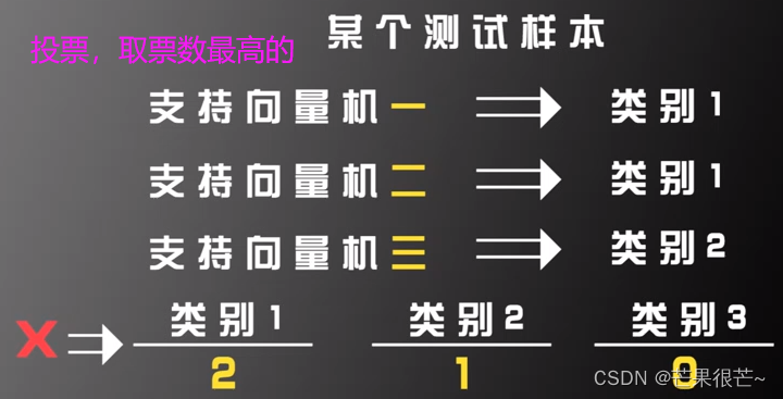 Three support vector machine pairs of categories 1 Your score and =0.5-0.2=0.3 ; For categories 2 Your score and =-0.5+0.4=-0.1; For categories 3 Your score and =0.2-0.4=-0.2; Category 1 Get the highest score and , Therefore, the final recognition result is category 1.