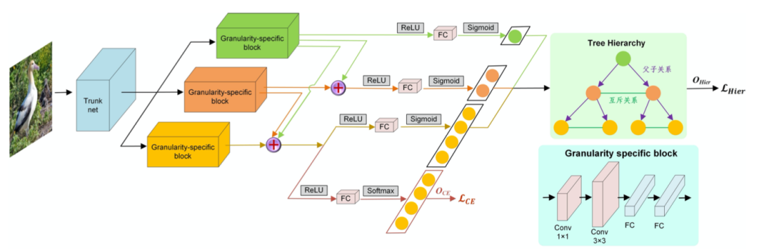 我们从三点观察出发构建我们的层级多粒度分类算法:(1)由于细粒度类别可以根据不同层次的抽象向上不停迭代归类形成树形类别结构,我们构建对应的标签关系树建模层级类别间的语义关系;(2) 基于标签关系树设计复合损失函数,使得具有不同层级粒度标注的样本在学习时可以传递层级间的知识;(3)现实世界中位于低层级的子类除了拥有自己的独特属性还会进一步继承来自父类的属性,我们首先为每个层级设置专有的特征提取层,根据主干网络输出的特征提取各个层级相关的特征。