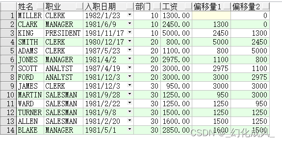 nvl(sal - min(sal) over(partition by deptno order by sal), 0) Departmental minimum wage difference ,