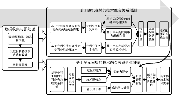 The overall research process is as follows chart 1 Shown . Design network structure similarity index based on Patent Classification co-occurrence network and text information 、 Semantic similarity index , The fusion constitutes the vector representation of each pair of Patent Classifications , Then as the input of the random forest model, the technology fusion relationship is predicted , Obtain candidate set of technology fusion relationship ; Starting from influence and growth potential , Based on the patent classification and citation network and the metrological characteristics of patent documents, the technical value of the field is constructed 、 Business value and strategic value evaluation indicators , The multiple regression model is obtained by training with the quoted number ; Finally, the resulting model is used to evaluate the technology fusion relationship , Screening and acquiring high-value technology integration relationships .