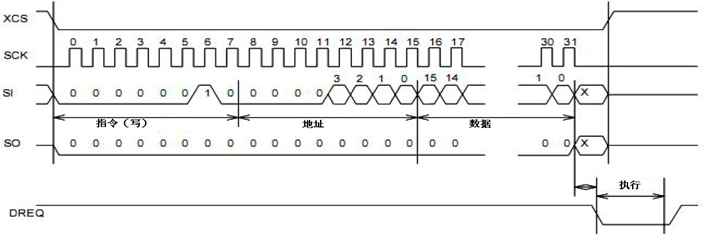 写指令为:0X02,数据通过SI写入VS1053, SO则一直维持低电平。