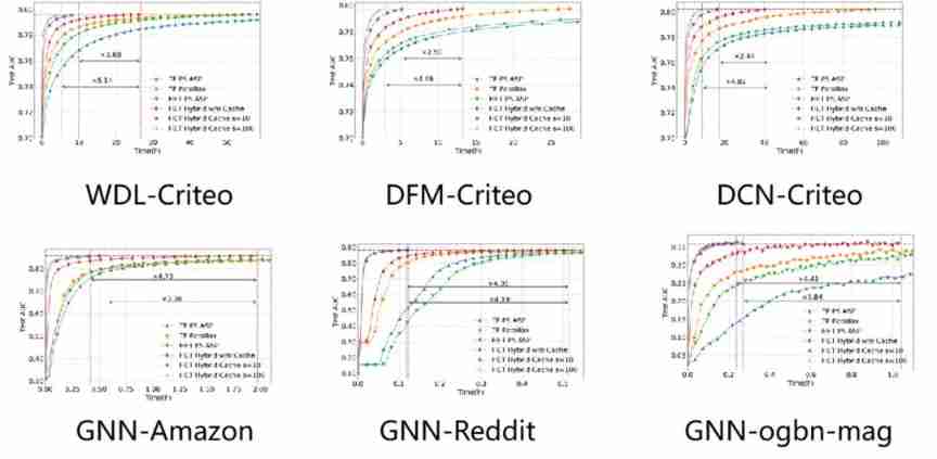We will HET And based on traditional parameter server architecture TensorFlow And the design of the hybrid communication architecture of parameter server and global protocol Parallax[ See note 3] Compared with , The selected data sets and models include : Recommended model Wide&Deep(WDL)、DeepFM(DFM)、Deep&Cross(DCN) And datasets Criteo, With more than 30 million sparse features , When Embedding Expand the dimension to 4K when , Model parameters can reach trillions ; And graph learning model GraphSAGE And datasets Reddit、Amazon、ogbn-mag(OGB It is also one of the most authoritative graph learning benchmark data sets ,Open Graph Benchmark).