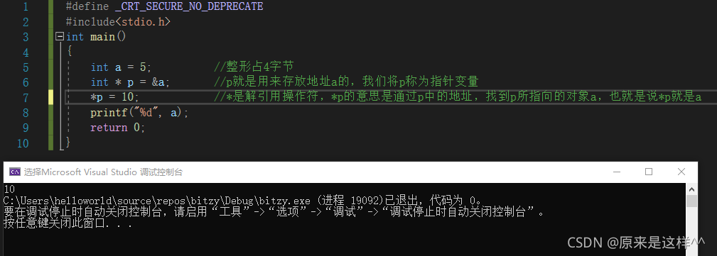 存放好地址后我们就可以解引用了 * , *是解引用操作符,*p的意思是通过p中的地址,找到p所指向的对象a,也就是说*p就是a