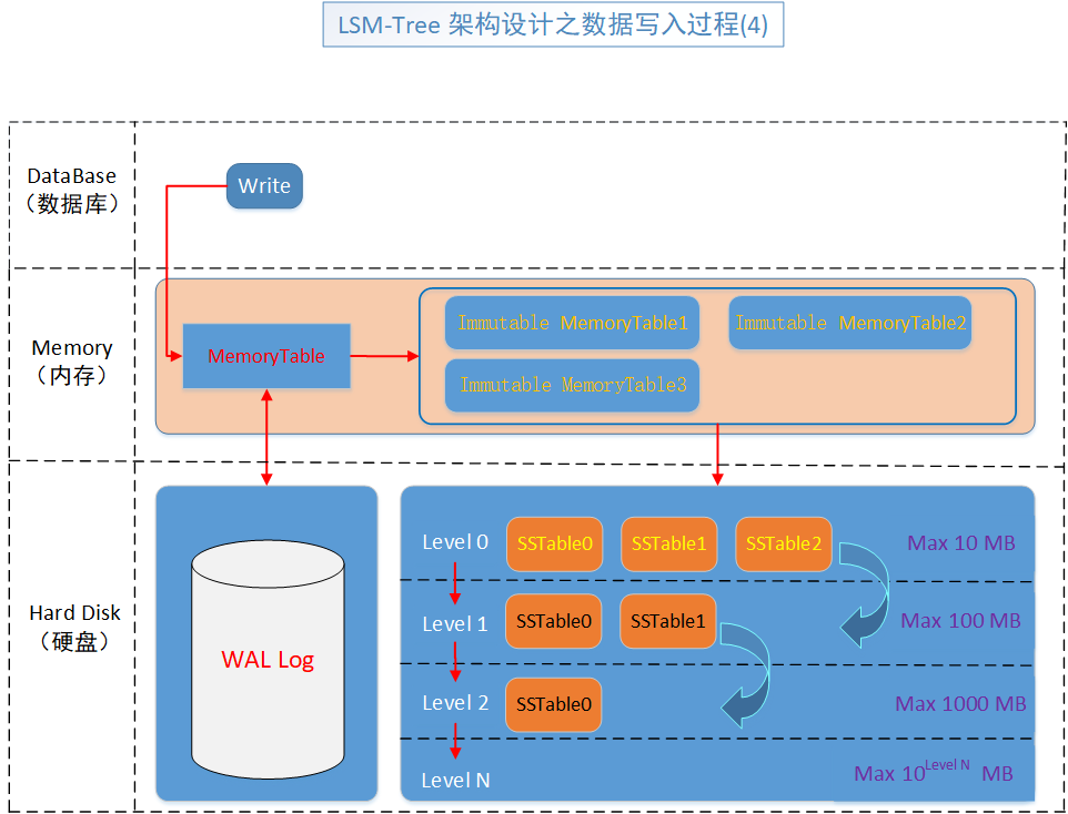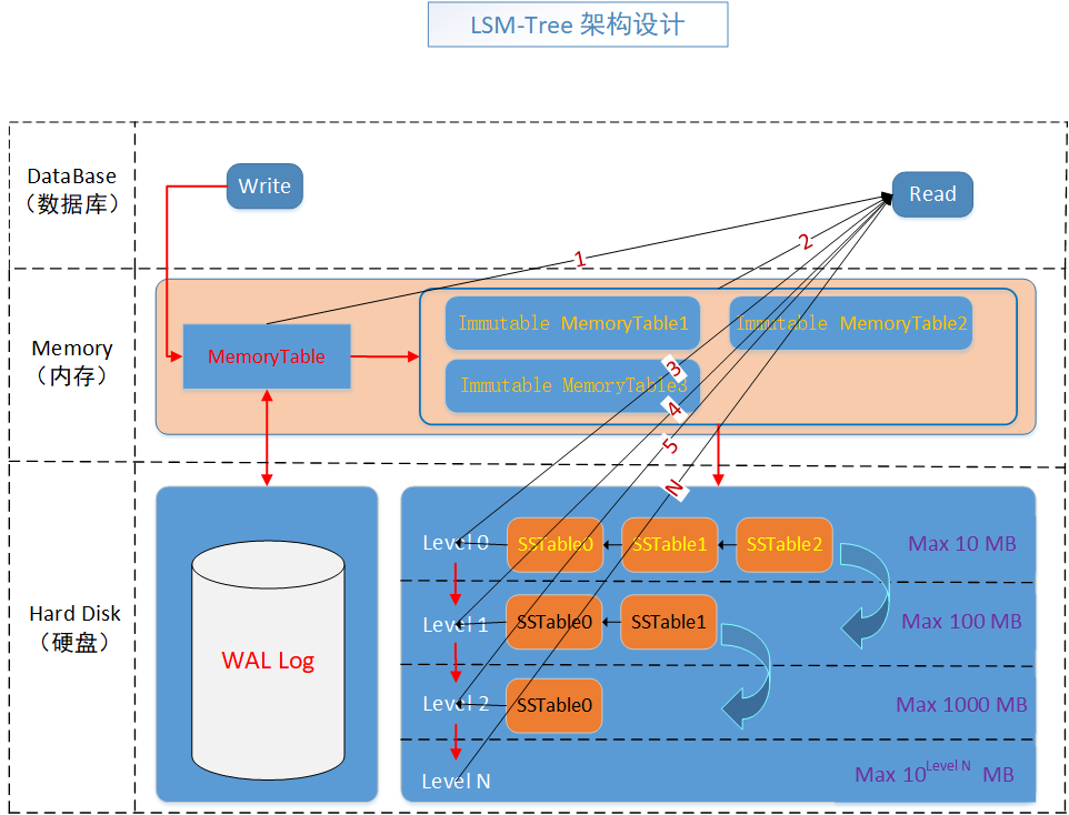 整体包含大致三个部分,数据库操作部分(主要为读和写),内存部分(缓存表和不变缓存表)以及硬盘部分(WAL Log 和 SSTable),这三个部分。