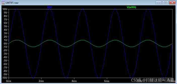 2、 Here's a 741 Internal schematic diagram of operational amplifier , Input 500hz The sine wave of , The magnification is 10 times (1+9k/1k), The output amplitude is 10v Of 500hz Sine wave .