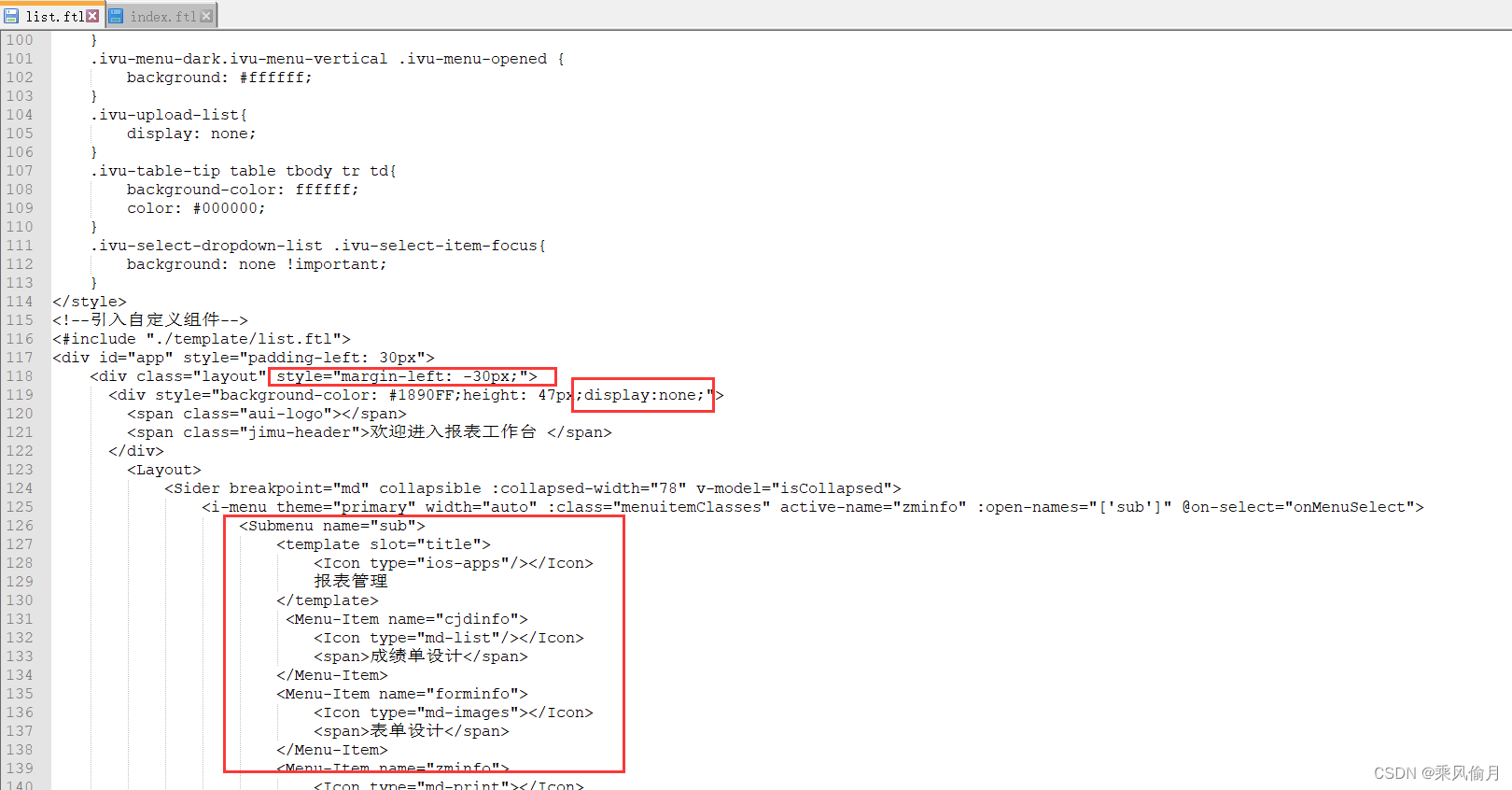 Use Notepad++ The text tool opens list.ftl file , Modification does not display title Welcome to the contents of the report workbench , add display:none; in addition , Change the menu name on the left to what you want , At the same time, it can increase and also reduce , It can be formulated according to business needs .