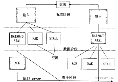 - 握手阶段,host向device发送事物类型请求,通过分组标识符来进行识别,接收信息方发送ack表示接收成功;nak表示失败;stall表示不可预知错误。