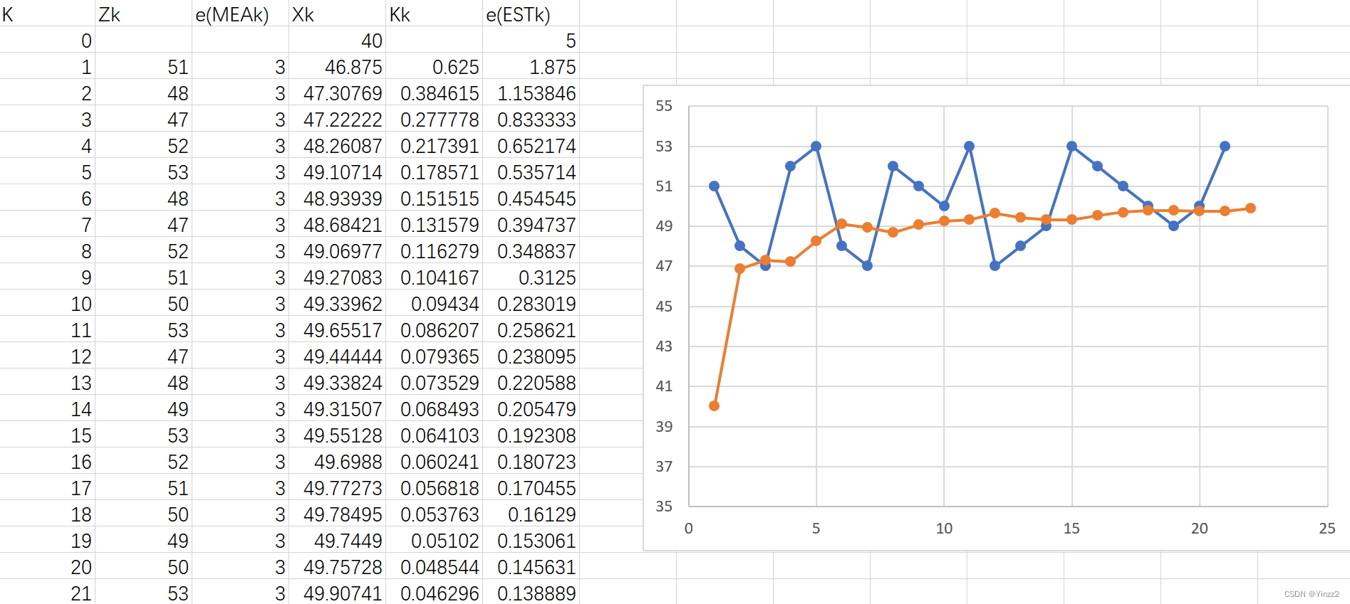 后面类推可以得到这样数值与图像(蓝色为Zk,红色Xk)