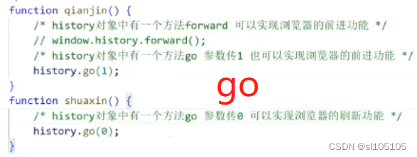 Attributes are back( back off ),forward( Forward ),go( Refresh ) Be careful :go(1) Forward ,go(2) Advance to the second page ,go(-1) back off ,go(0) Refresh