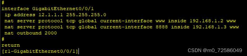 [r1-GigabitEthernet0/0/1]nat server protocol tcp global current-interface 80 inside 192.168.1.2 80