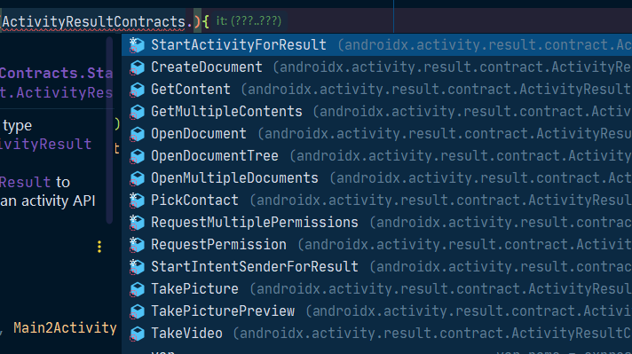 StartActivityForResult: 通用的Contract,不做任何转换,Intent作为输入,ActivityResult作为输出,这也是最常用的一个协定。CreateDocument: 提示用户选择一个文档,返回一个(file:/http:/content:)开头的Uri。GetContent: 提示用选择一条内容,返回一个通过ContentResolver#openInputStream(Uri)访问原生数据的Uri地址(content://形式) 。默认情况下,它增加了 Intent#CATEGORY_OPENABLE, 返回可以表示流的内容。GetMultipleContents:获取多条内容OpenDocument: 提示用户选择指定类型文件(输入参数为mimeType),返回用户所选文件UriOpenDocumentTree: 提示用户选择一个目录,并返回用户选择的作为一个Uri返回,应用程序可以完全管理返回目录中的文档。OpenMultipleDocuments: 提示用户选择文档(可以选择多个),分别返回它们的Uri,以List的形式。PickContact: 从通讯录APP获取联系人RequestMultiplePermissions:用于请求一组权限RequestPermission: 用于请求单个权限TakePicturePreview: 调用MediaStore.ACTION_IMAGE_CAPTURE拍照,返回值为Bitmap图片TakePicture: 调用MediaStore.ACTION_IMAGE_CAPTURE拍照,并将图片保存到给定的Uri地址,返回true表示保存成功。TakeVideo: 调用MediaStore.ACTION_VIDEO_CAPTURE拍摄视频,保存到给定的Uri地址,返回一张缩略图。