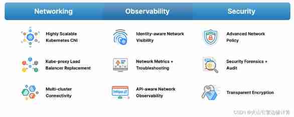 Check the website , You can see Cilium Its functions mainly include Three aspects , Pictured above :