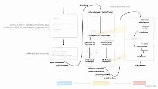 Different from the top-down execution of traditional scripts , once Gradle Building involves multiple files , The main process is as follows :
