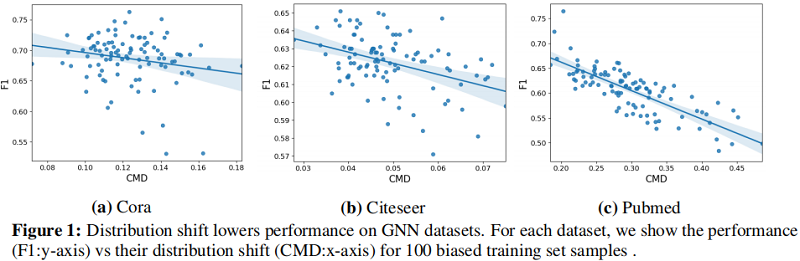 Figure 1 It shows that the influence of distribution shift caused by sample deviation directly reduces the performance of the model . By using nodes GCN The model plots the distributed displacement distance values of three data sets ( $x$ Axis ) And the corresponding model accuracy ( $y$ Axis ) The relationship between .
