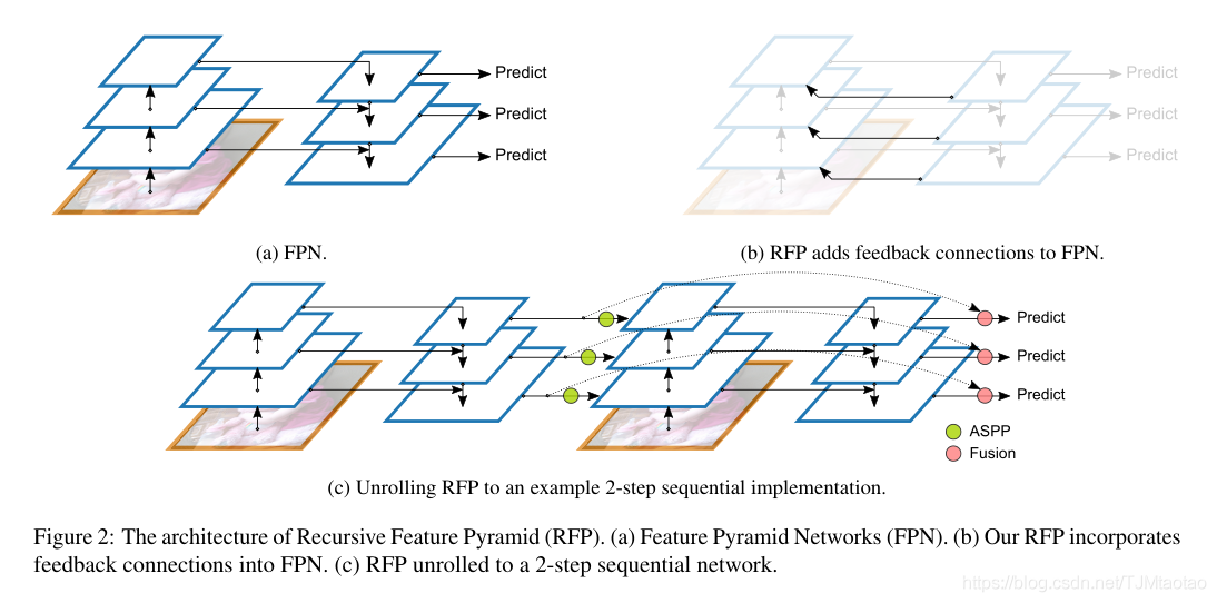 递归卷积网络。为了解决不同类型的计算机视觉问题,人们提出了许多递归方法,如[32,42,65]。最近,CBNet[51]提出了一种递归的目标检测方法,它将多个骨干网级联,输出特征作为FPN的输入。相比之下,我们的RFP使用包含有效融合模块的、富含ASPP的FPN执行递归计算。