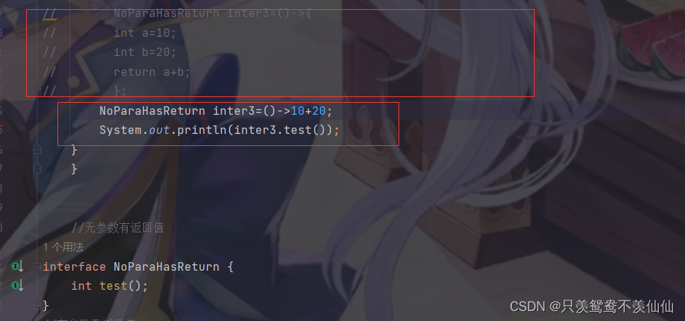 规则4:若抽象方法存在返回值且覆写的方法体只有一行,此时方法体的大括号,retur都可以省略