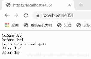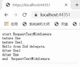 Use Links multiple request delegates together .next Parameter represents the next delegate in the pipeline . Can be called by not calling next The parameter short-circuited the pipe . Operations can usually be performed before or after the next delegate , This is shown in the following example :